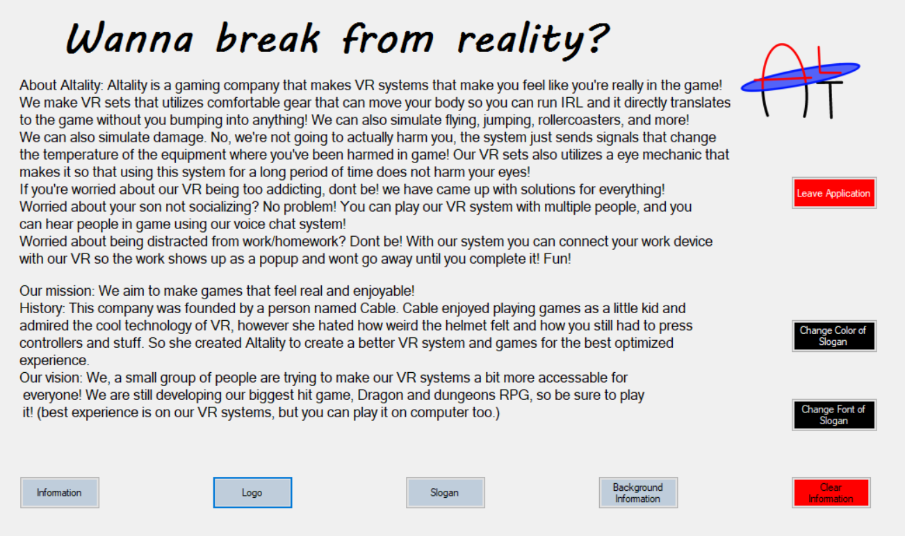 My Company9/5/2024My first project! In here we started on the basics of C#, learning how to make simple labels and buttons. I drew the company logo in this one. |