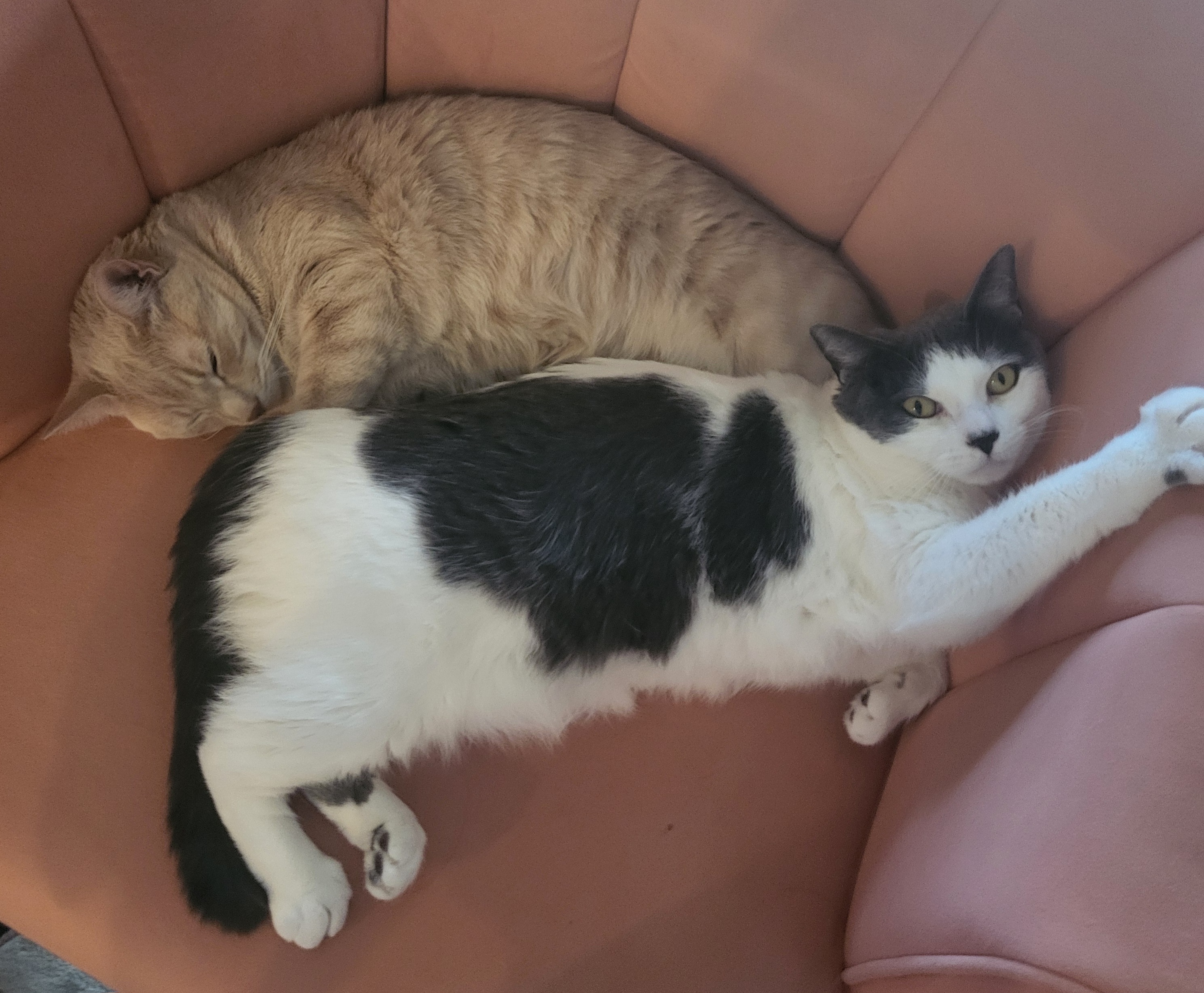 I have two cats at home. Their names are Autumn (orange tabby) and Raindrop (grey and white cat).